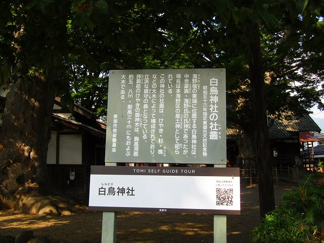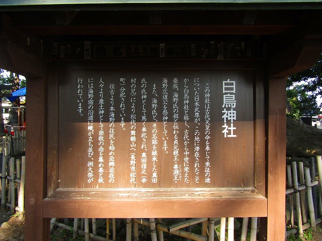 資料として気になる街角 撮っておきや!(by UFO先生) 白鳥神社は、平安時代にこの地に鎮座していたことは、明らかである。 それは、「源平盛衰記」に記される木曽義仲挙兵のくだりによる。 義仲は、治承五年(一一八一年)海野氏を中心に白鳥河原で兵を挙げた。 この白鳥こそ白鳥大明神である。 これが史書の初出であるが、白鳥神社の創建が、いつであるかは、明確ではない。 しかし、海野の地は、奈良時代に海野郷と称し、この地から献上された品が、正倉院御物として残っている。 そんな事からも、白鳥神社の創建は、奈良から平安にかけてと推測できる。 白鳥神社は、日本武尊・貞元親王・善淵王・海野広道公の四柱を御祭神として祀っている。 日本武尊は、第十二代景行天皇の第二皇子で、西征・東征と奔走された。 この東征の帰り道に海野にご滞在になったと伝えられている。 その後、日本武尊は、伊勢の国でお亡くなりになり、白い鳥に化身される。 海野にもこの白い鳥が舞い降りる。そこで、 海野の民は、お宮を建て、日本武尊を祀った。 そして、仲哀天皇の二年、勅命により、白鳥大明神と御贈号されたと伝えられている。 貞元親王(さだやすしんのう)は、第五十六代清和天皇の第四皇子で、 眼病を患い祢津の山の湯で養生され、白鳥大明神で祈願され、平癒されたと伝えられている。 海野広道公は、海野氏の初代である。 このように、白鳥神社は、日本武尊と海野氏の祖をお祀りしているお宮である。 その後、海野氏の子孫である真田氏により、篤く尊崇を受けることとなった。 そして、真田家が松代へ移封となり、白鳥大明神を松代へ分社し、安政五年、海野神社と改称している。 (白鳥神社HPより) (※=マウスポインターを画像上に置いて下さい) やはり持ってるものはUPして