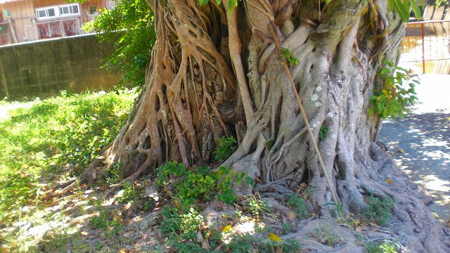 資料として気になる街角 撮っておきや!(by UFO先生) アコウ(赤榕・赤秀・雀榕、学名: Ficus superba var. japonica)は、 クワ科イチジク属の半常緑高木。 葉を乾かして焼くとよい香りを発するので、 沈香木(じんこうぼく)とよばれる。 日本では、紀伊半島(和歌山県南部)および 山口県、四国南部、九州、南西諸島などの温暖な地方に分布する。 日本国外ではアジア南東部の台湾や中国南部沿岸、東南アジアなどに分布している。 暖地の海岸など、沿岸地に自生する。 主な低地に生育し、琉球諸島では石灰岩地にも生育する。 常緑広葉樹の高木で、樹高は約10 - 20メートル (m) 、幹径は1 mほどに達する。 高さに対して樹幹が横にも大きく広がる。樹皮は褐色で皮目が多い。 若い枝はやや太く無毛で、托葉痕が一周する。幹は分岐が多く、 幹や枝から多数の気根を垂らし、岩や露頭などに張り付く。 防風樹、防潮樹、街路樹として利用される。 沖縄県や鹿児島県奄美群島では、防風のために人家のまわりに植えて屋敷林にも利用される。 日本では国の天然記念物に指定されている巨樹、古木も多い。 また、ガジュマルに比べると耐寒性が高いという特性を活かし、観葉植物としても用いられる。 (Wikipediaより) (※=マウスポインターを画像上に置いて下さい)